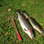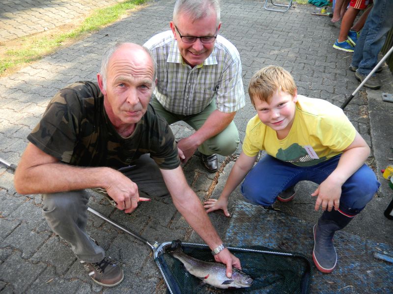 Mit Feuereifer wurden die Angelruten einsatzbereit gemacht, denn alle wollten den ersten Fisch an Land ziehen. Schon nach wenigen Minuten zappelten die ersten Forellen silbrig glänzend an den Angelhaken. Das Anlanden mit den Keschern wollte gelernt sein. Das waidgerechte Abködern und Schlachten übernahmen 18 Angler und Jungangler des Vereins.
