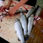 Nach der Pause mussten mehr als 150 gefangene Forellen ausgenommen und küchenfertig zubereitet werden. Die Buben und Mädchen beteiligten sich fleißig und ohne Scheu vor den blutigen Innereien. Unter den skeptischen Blicken von Bürgermeister Ewald Vögler gingen die Kinder sehr geschickt zur Hand.